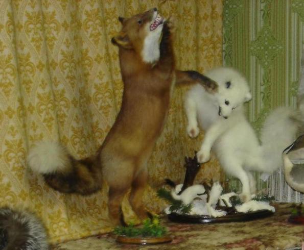 Отоварившись и расплатившись, мы обратили внимание на открытую дверь в другую пристройку, в которой на столе, рядом с батареей чистых стеклянных банок, расположились несколько искусно выполненных композиций с чучелами: лисы охотящейся за огромной бабочкой, песца играющего с двумя своими щенками, пёстрой утки в траве.