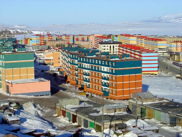 Первое, что сразу непривычно бросается в глаза, это дома, построенные на сваях, во избежание растепления вечной мерзлоты и, соответственно, опасности разрушения строений. А сами дома, тоже непривычно, но приятно для глаз, переливаются всеми цветами радуги - на бесконечно белом фоне заснеженной тундры, сопок и залива праздничное разноцветье пятиэтажек действительно радует душу, особенно в редкие солнечные дни.